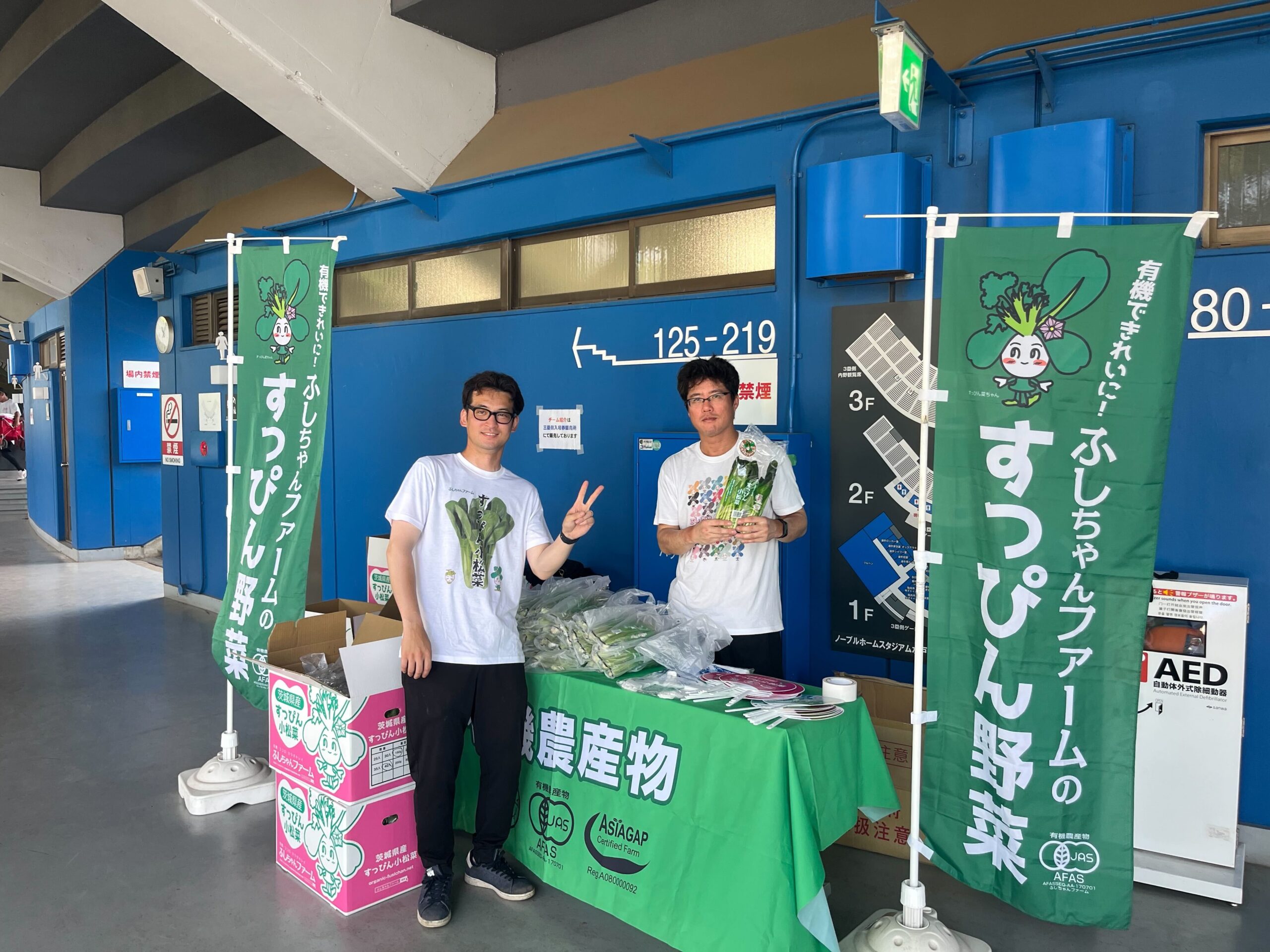 ふしちゃんファームはすっぴん有機野菜を配ったなの。
